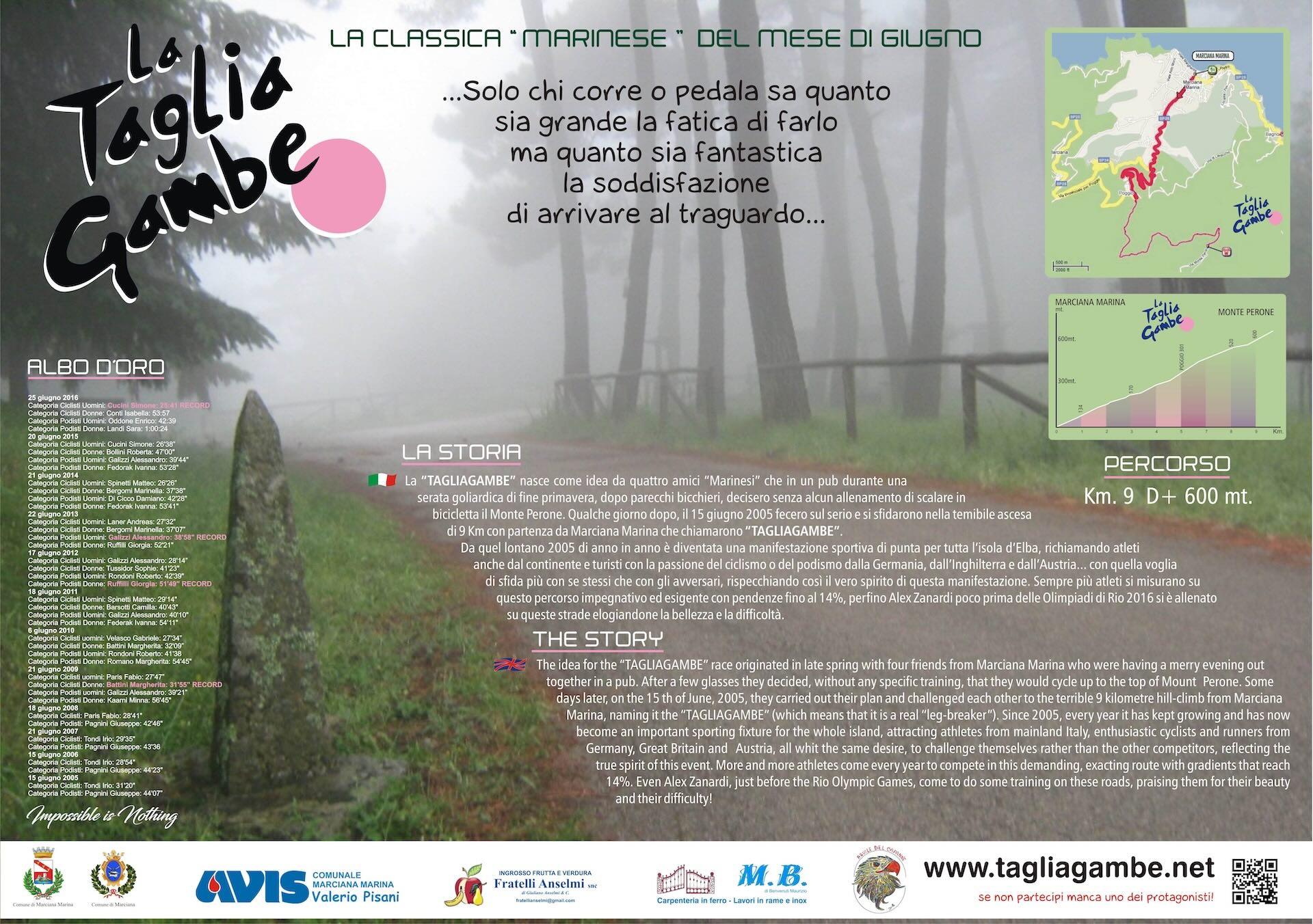 Con oltre 100 iscritti si è conclusa la 14^ edizione della Tagliagambe, manifestazione Ciclistica e Podistica sul tradizionale percorso che, sulla distanza di 9 Km, sale da Marciana Marina fino ai 600 mt del Monte Perone. Clicca qui per vedere le classifiche